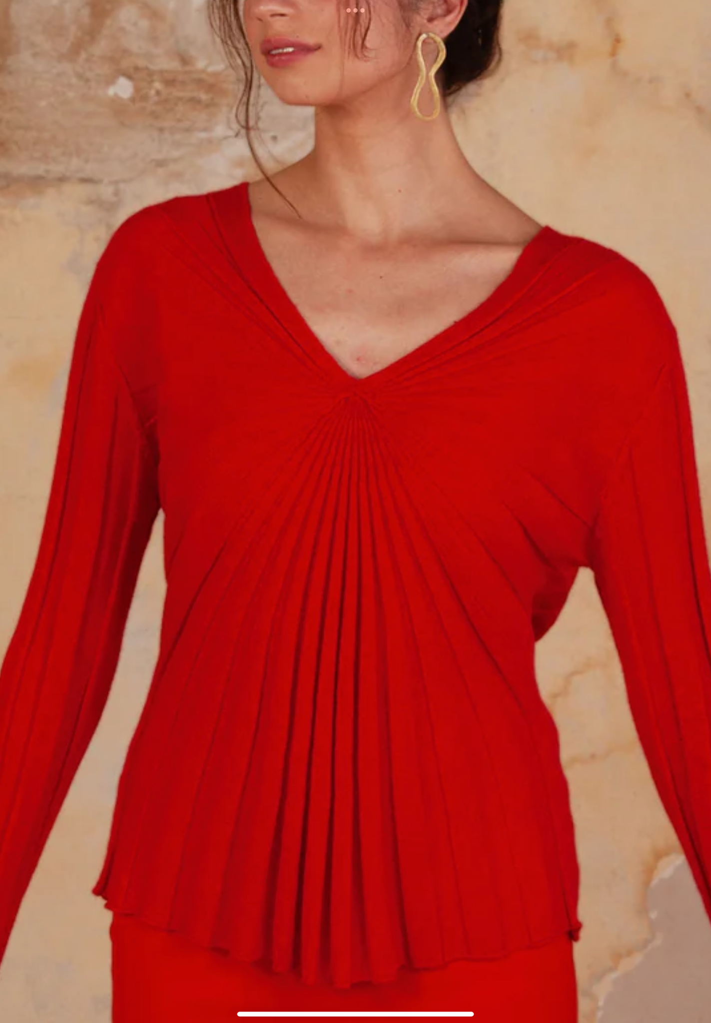 Ruby red knit top. We designed this illuminating style to match your sunny disposition! Adorned with a blissful pattern, you will exude a luminous glow as you slip into this top. Runs generous