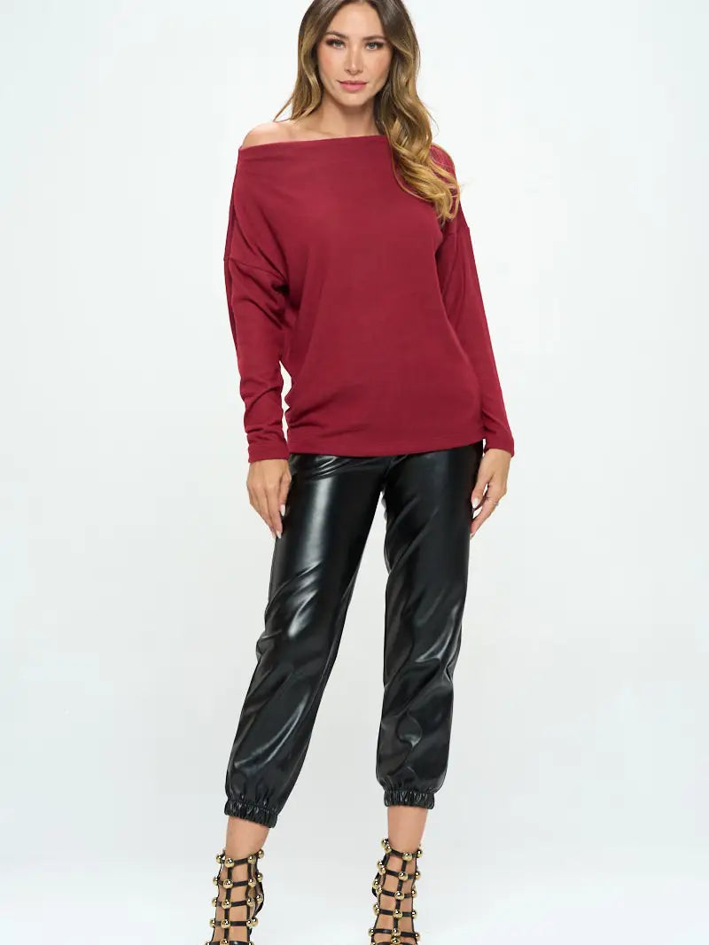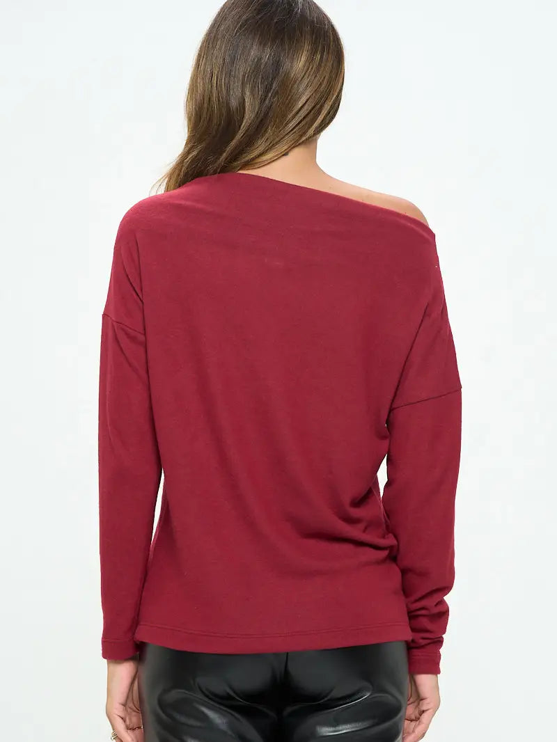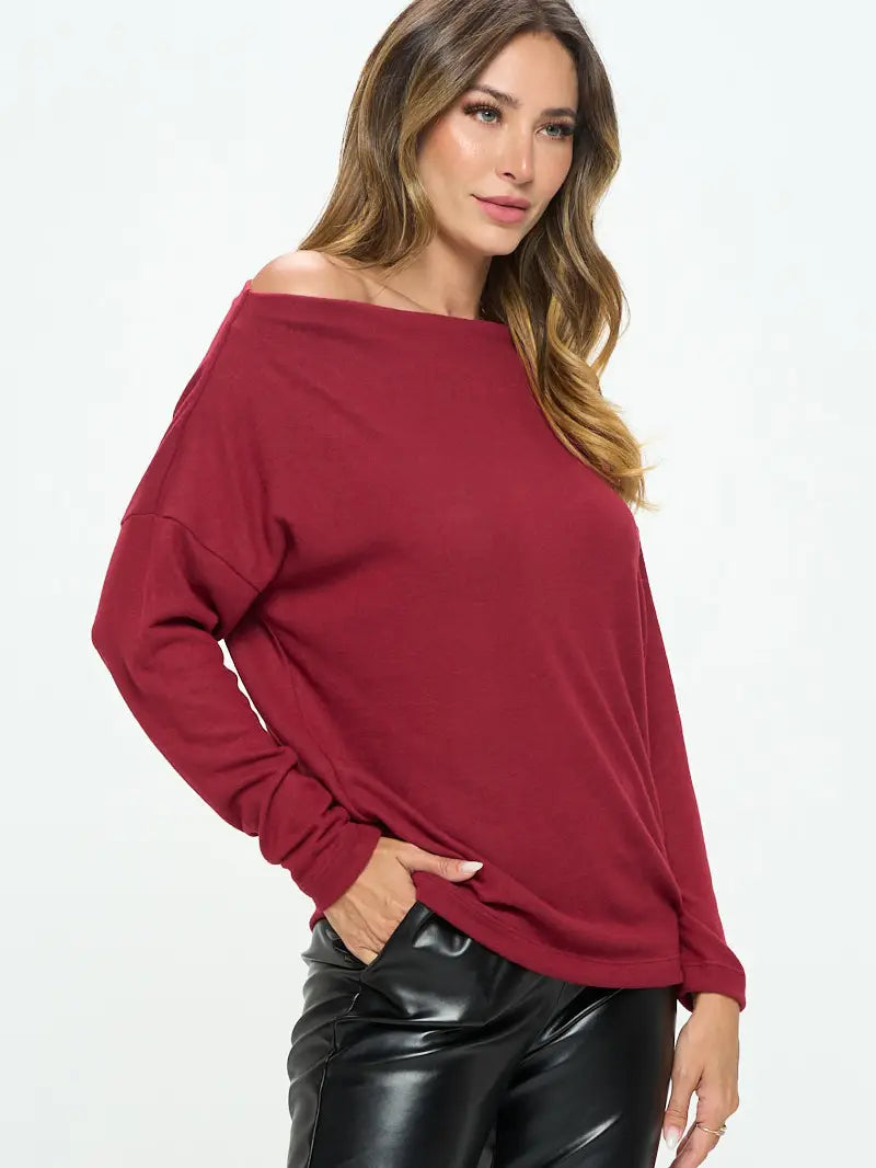 Made in USA Burgundy Brushed Knit Off the Shoulder Top. Available in other Colors. Fabric content: 97% Rayon, 3% Spandex.
