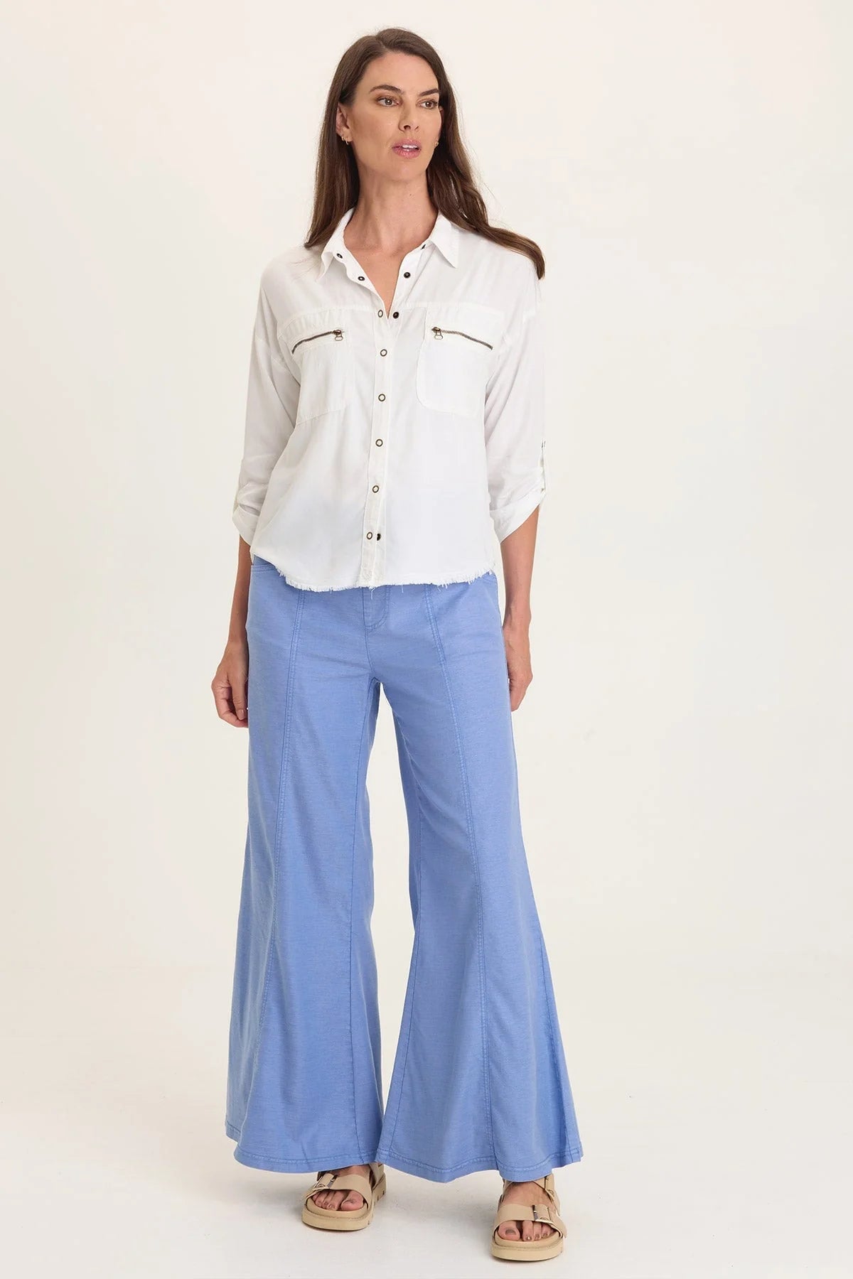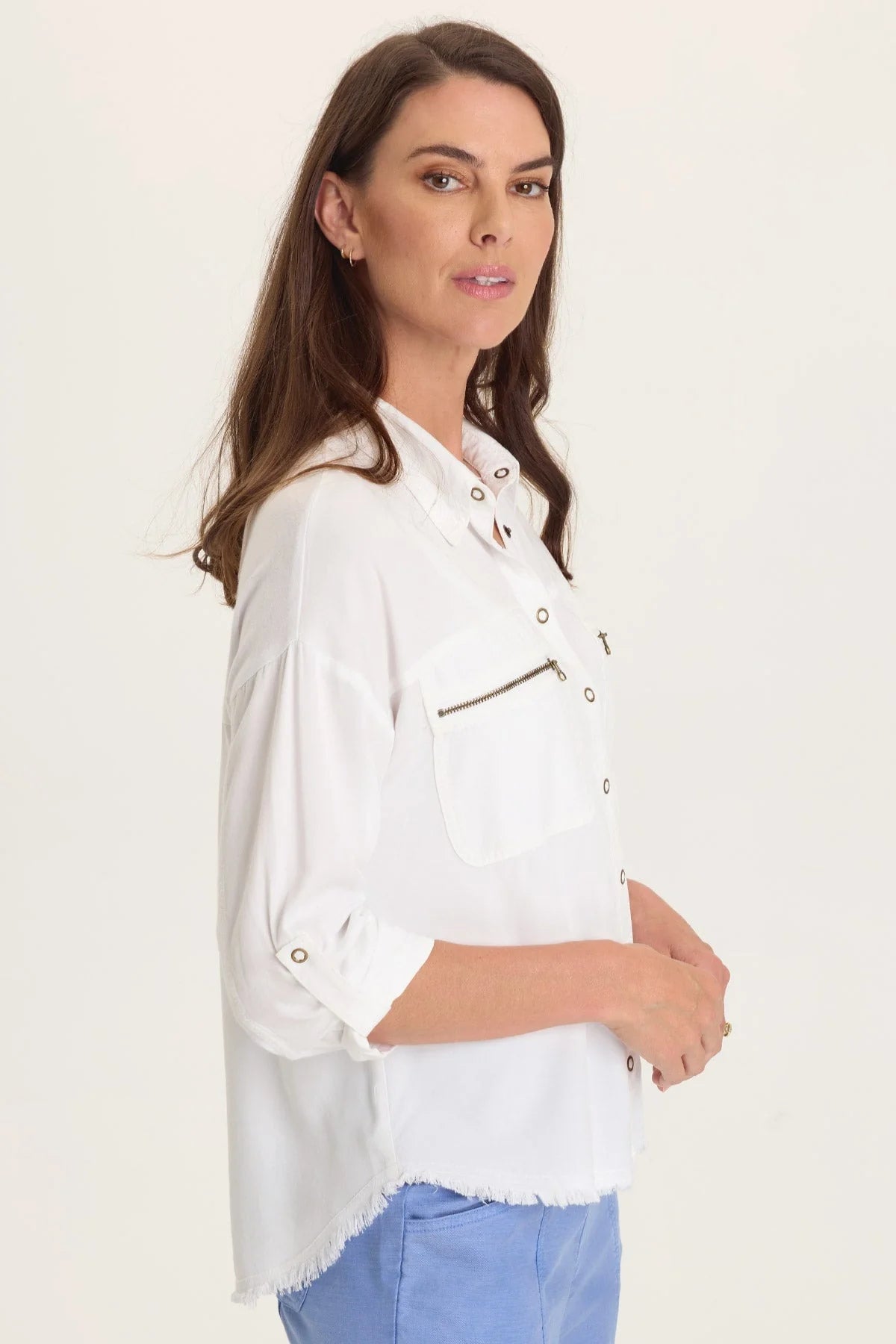 Tabbed three-quarter sleeves, zippered breast pockets, a classic collar, and a raw-edge hem round out this utility-inspired cargo shacket.