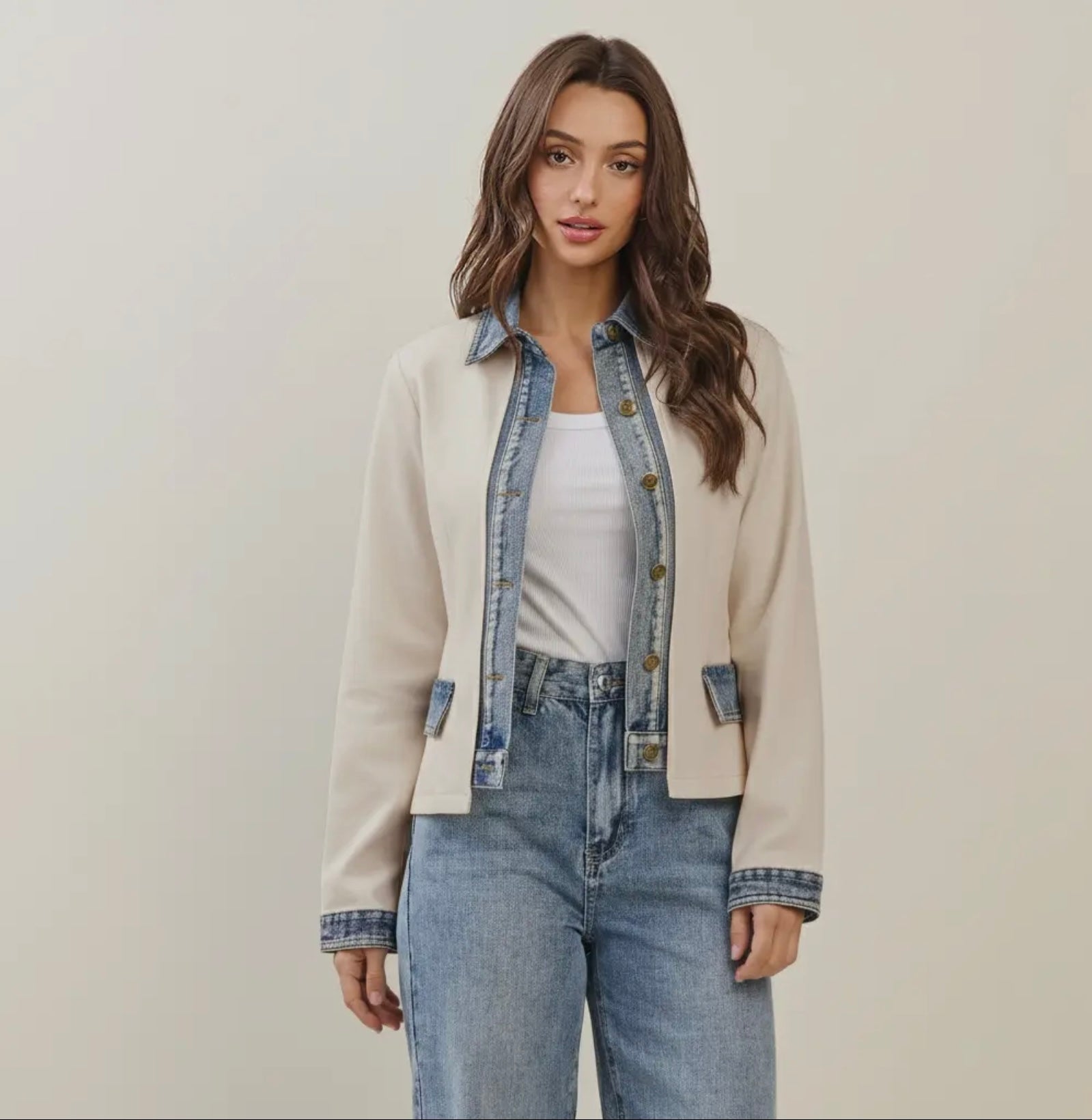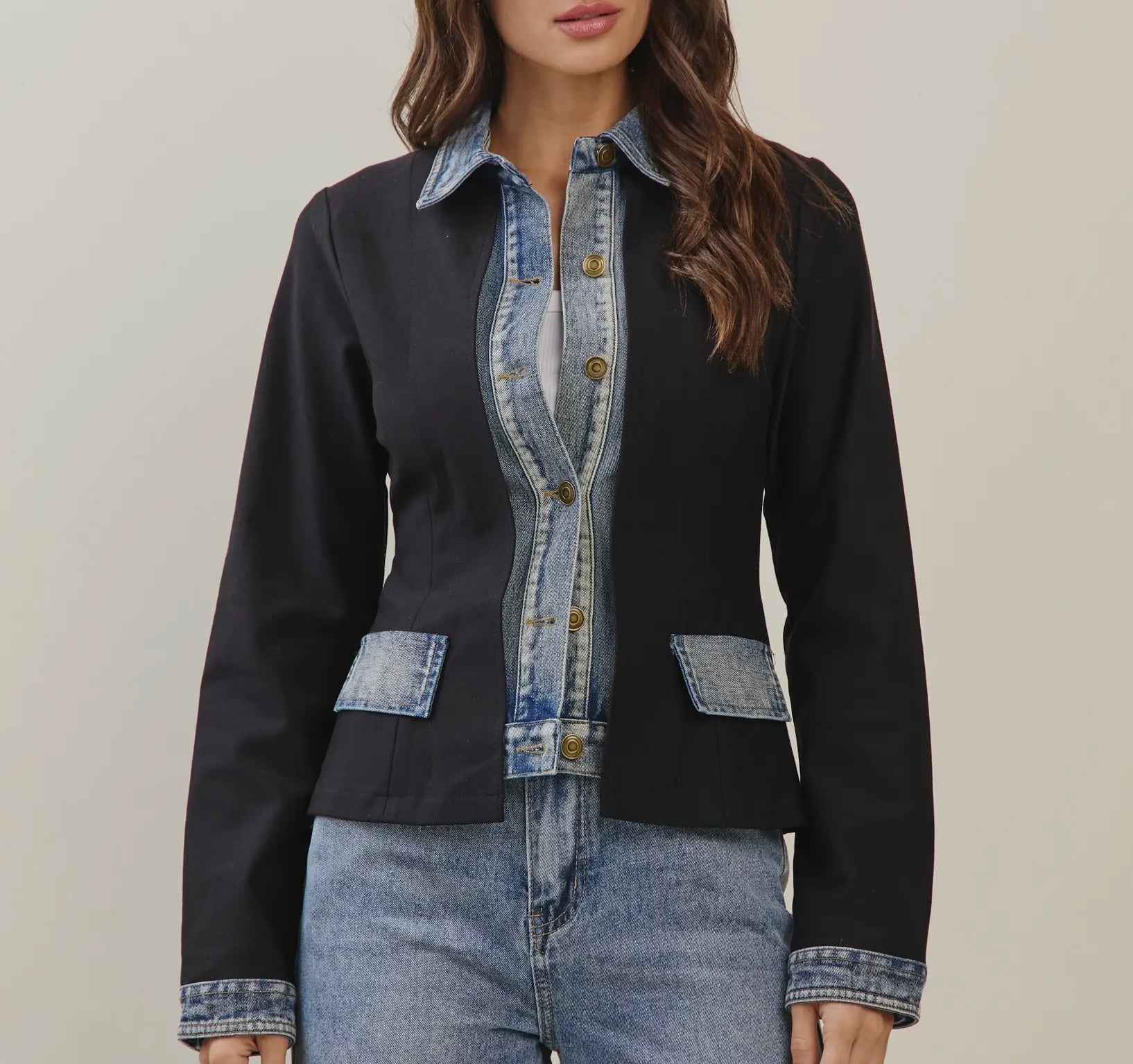 Fitted cotton stretch jacket with denim accents! A favorite! Runs smaller. Also available to black
