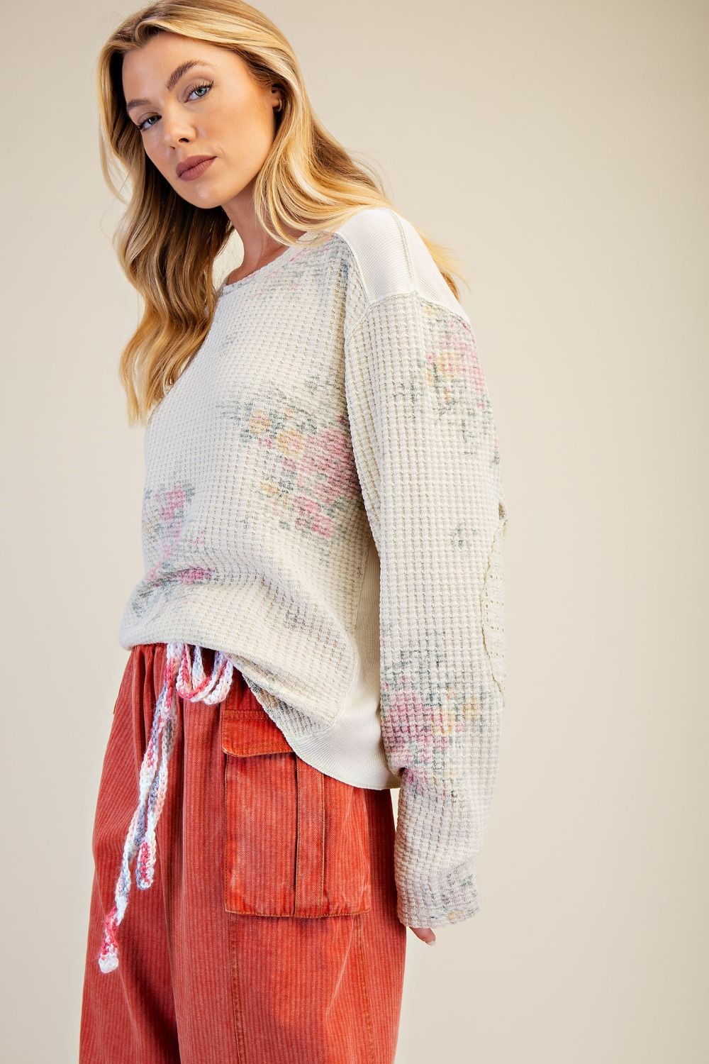 FLORAL PRINTED THERMAL MINERAL WASHED PULLOVER