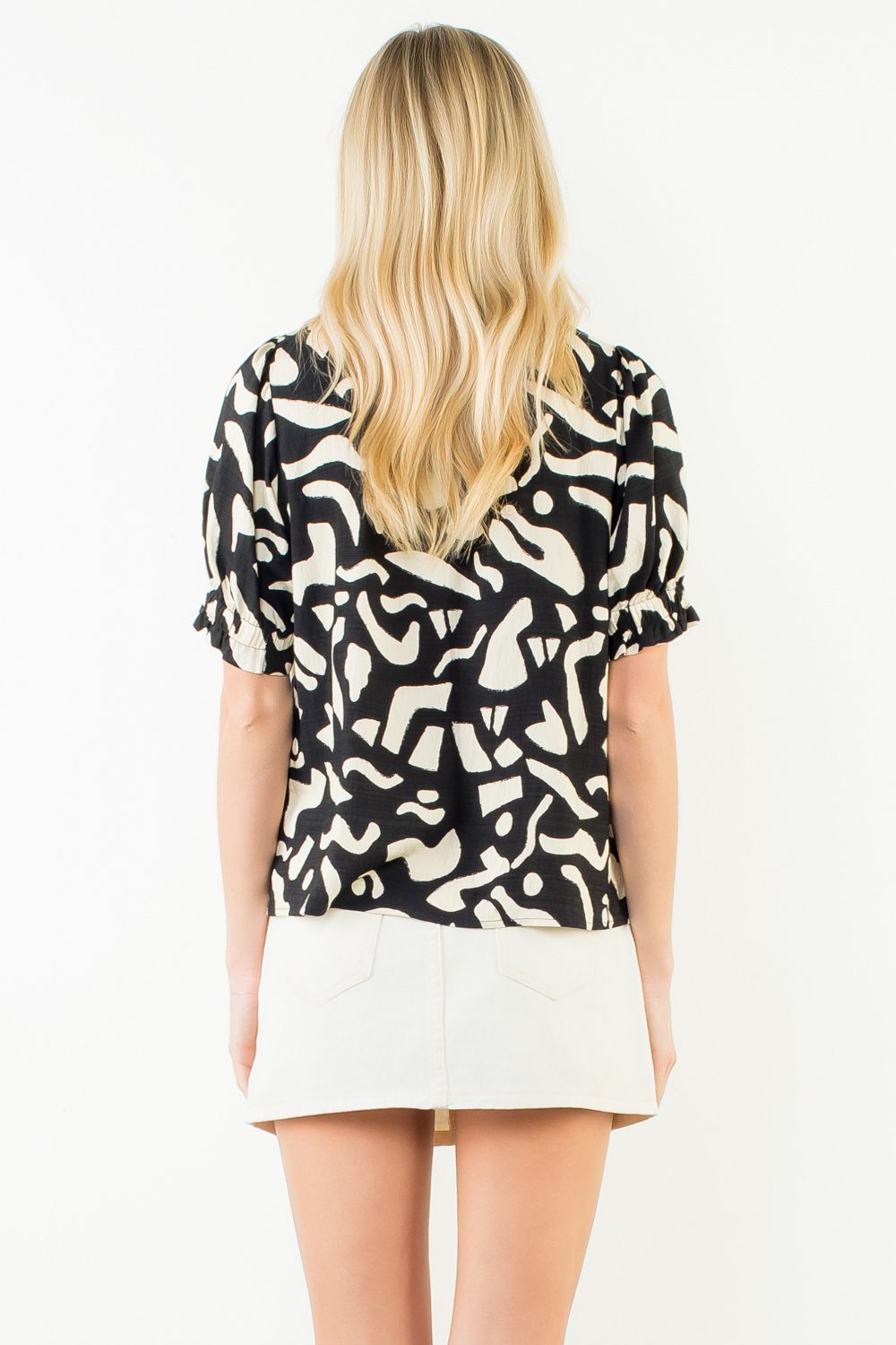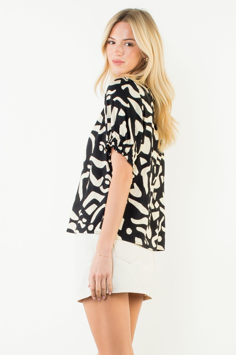 Abstract Geo Print Short Sleeve Top. Lightweight. Black and white