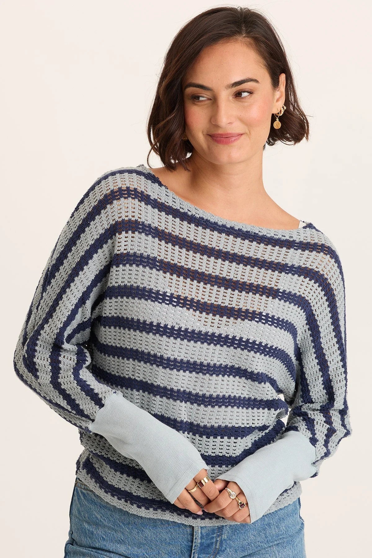 This boat neck, long sleeve pullover features a kimono sleeve and a bold navy stripe.