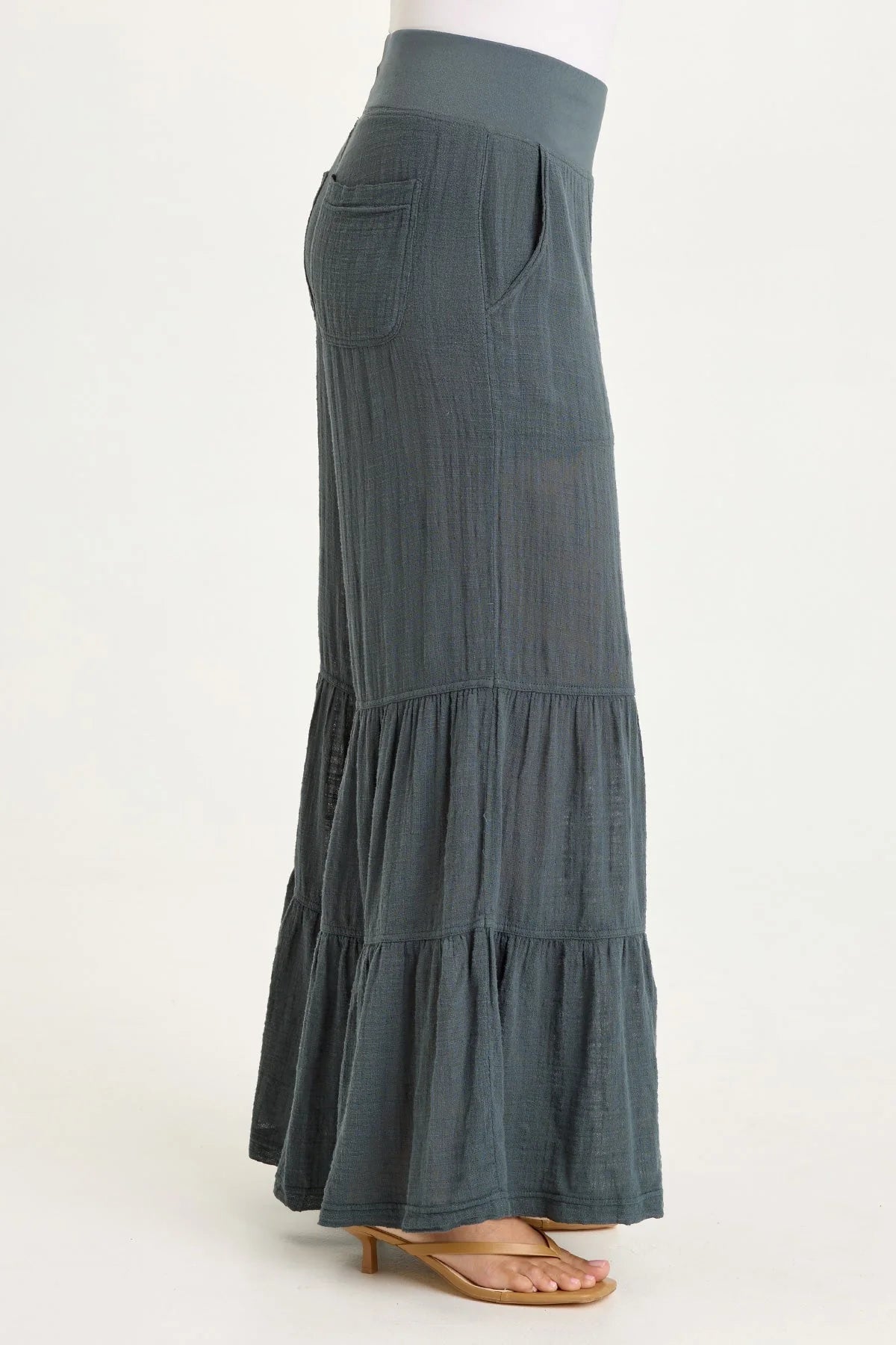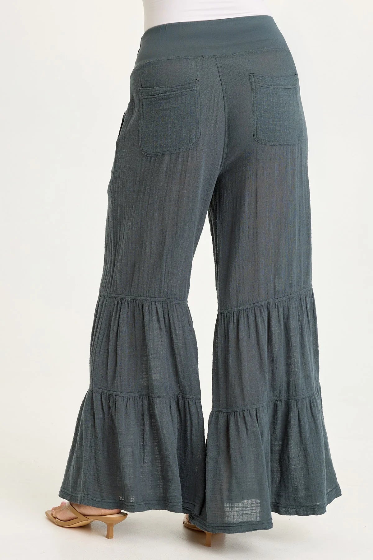 Tiered from the mid thigh to the wide leg opening, Lando has a high pull-on waist and front and back pockets.