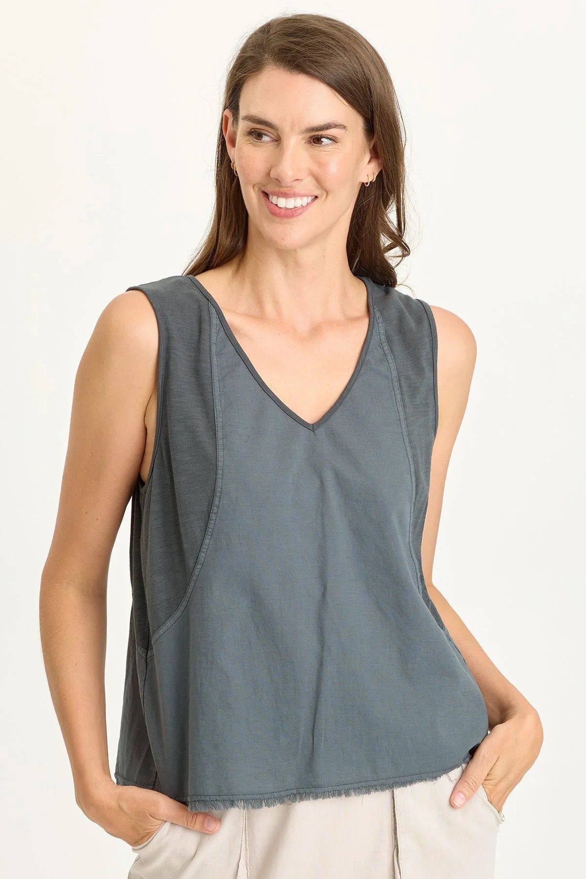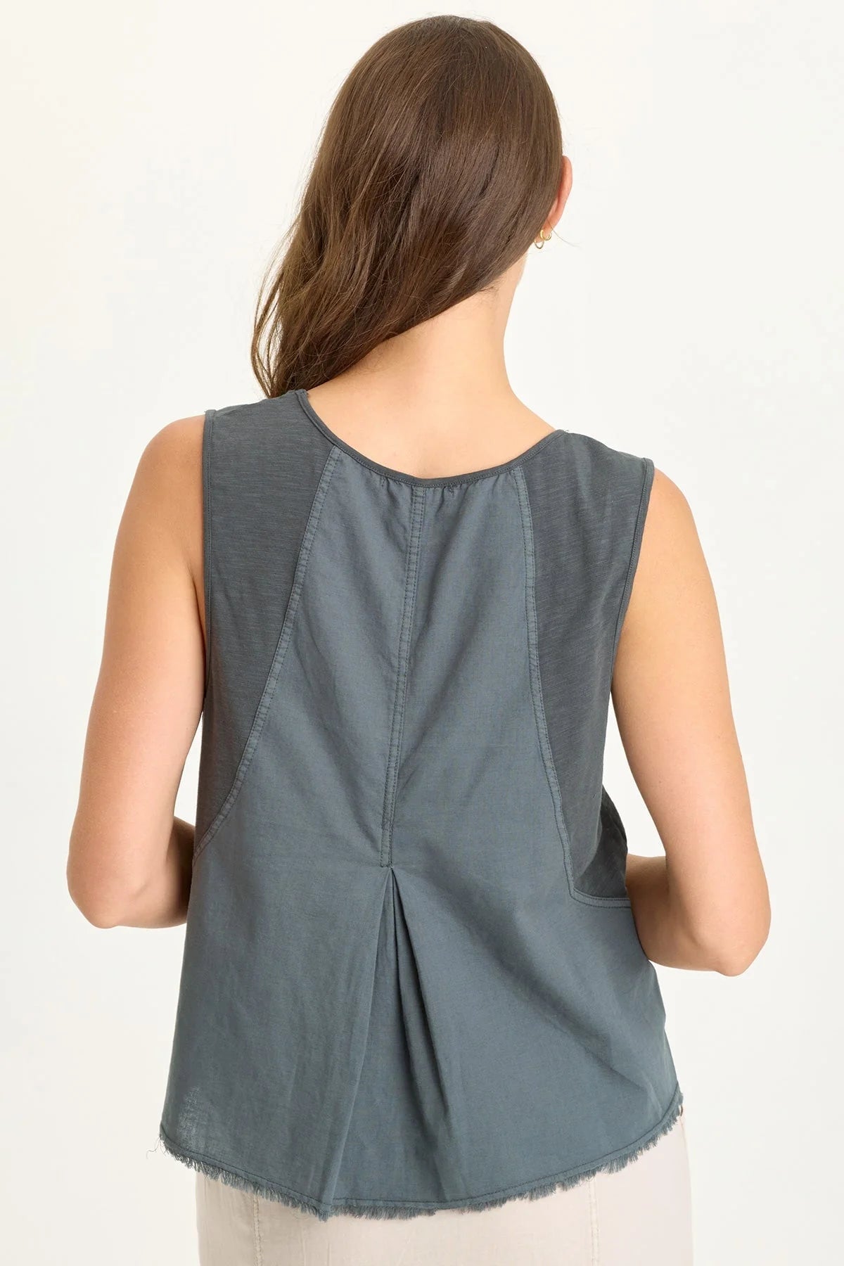 This v-neck tank features slimming seams, contrast jersey and a double inverted pleat at the center back.