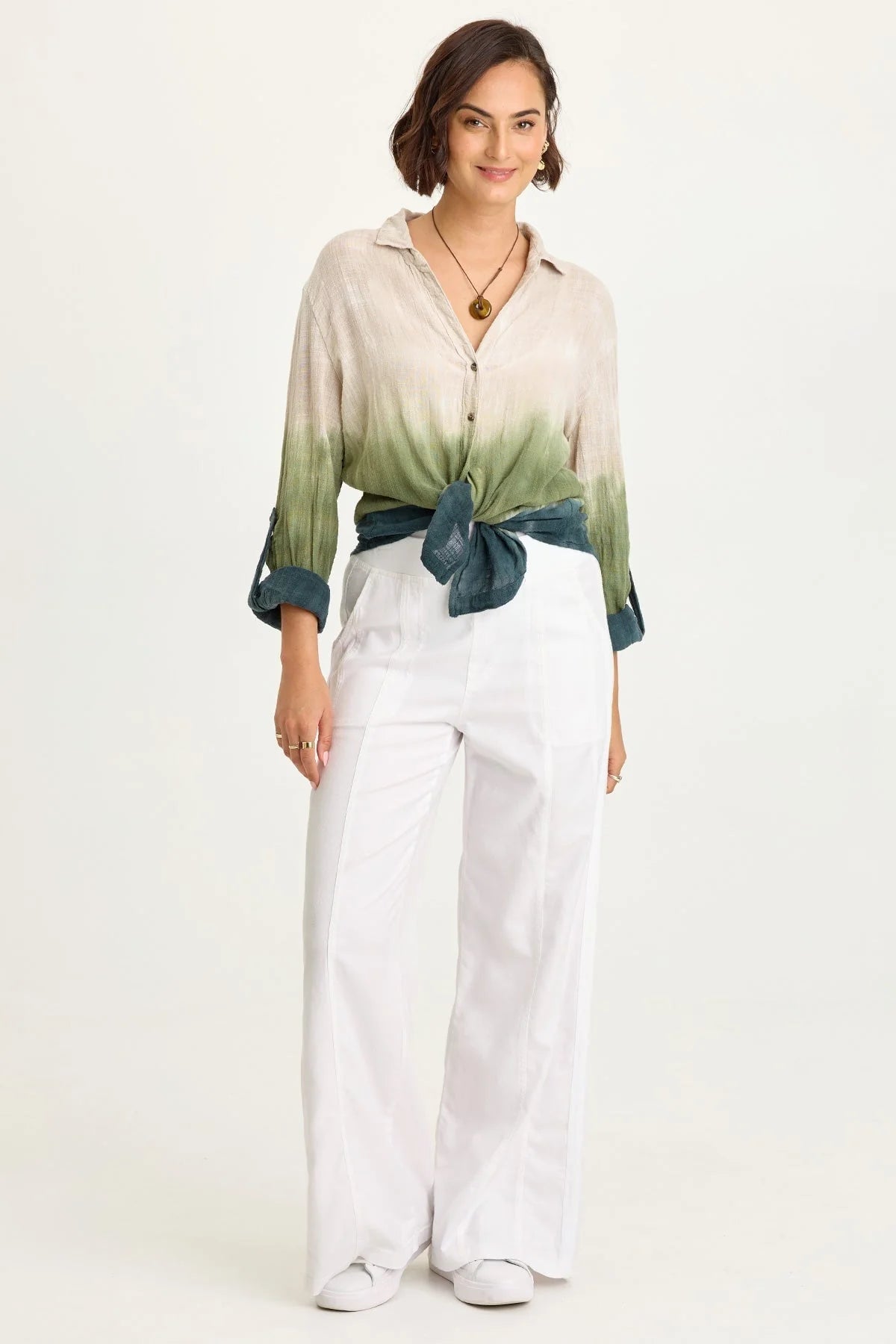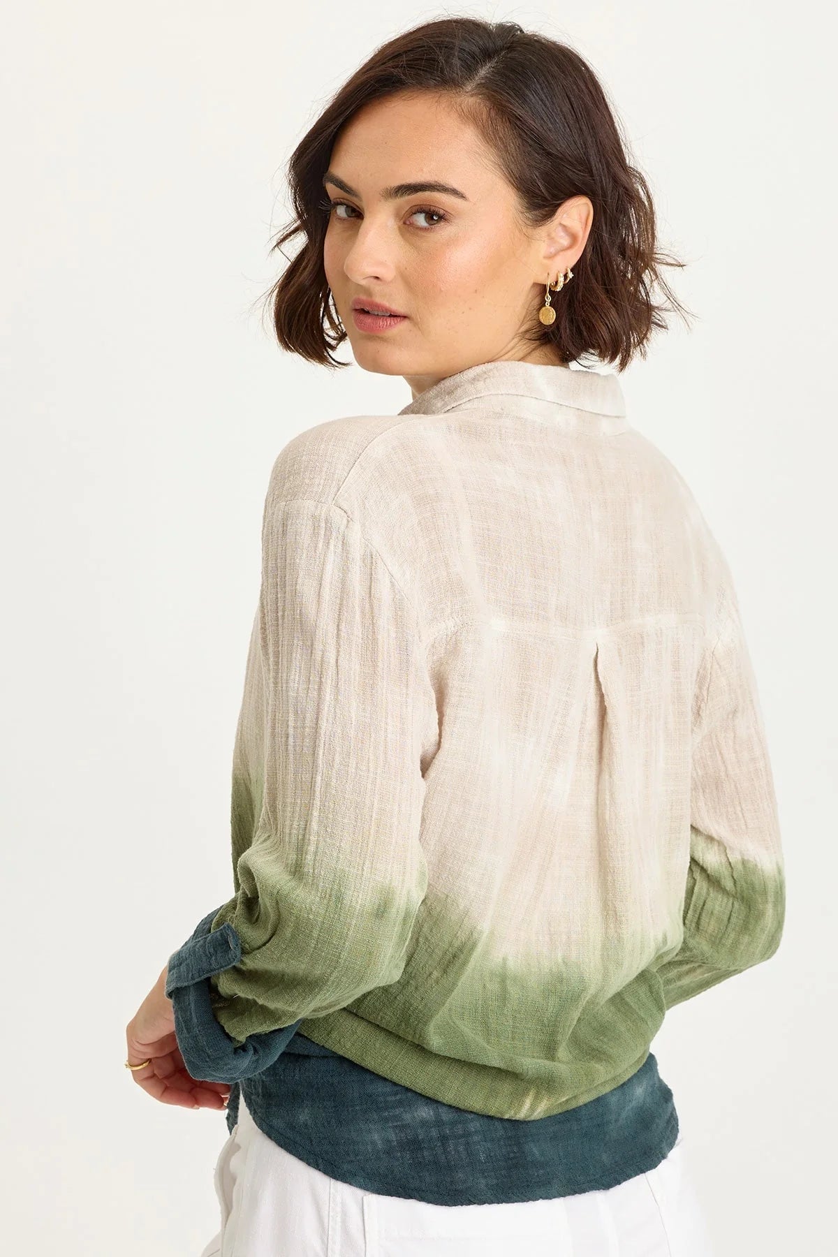 This gauze button-up blouse is great for layering. Features tabbed sleeve for easy rolling, curved hemline, and a box pleat on back.