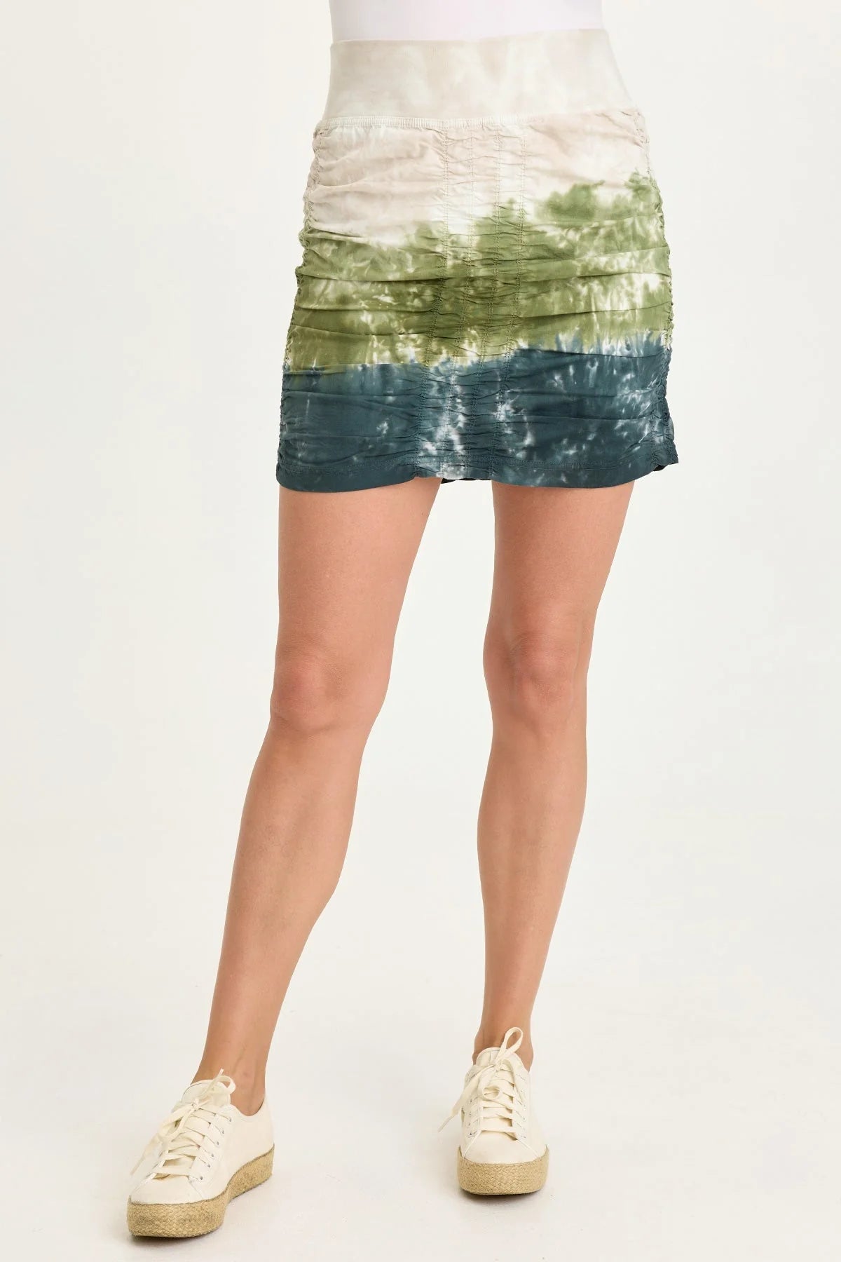 Easy, cozy and flattering, this skirt features a pull on jersey waistband and ruching at sides, front and back for a flattering look.