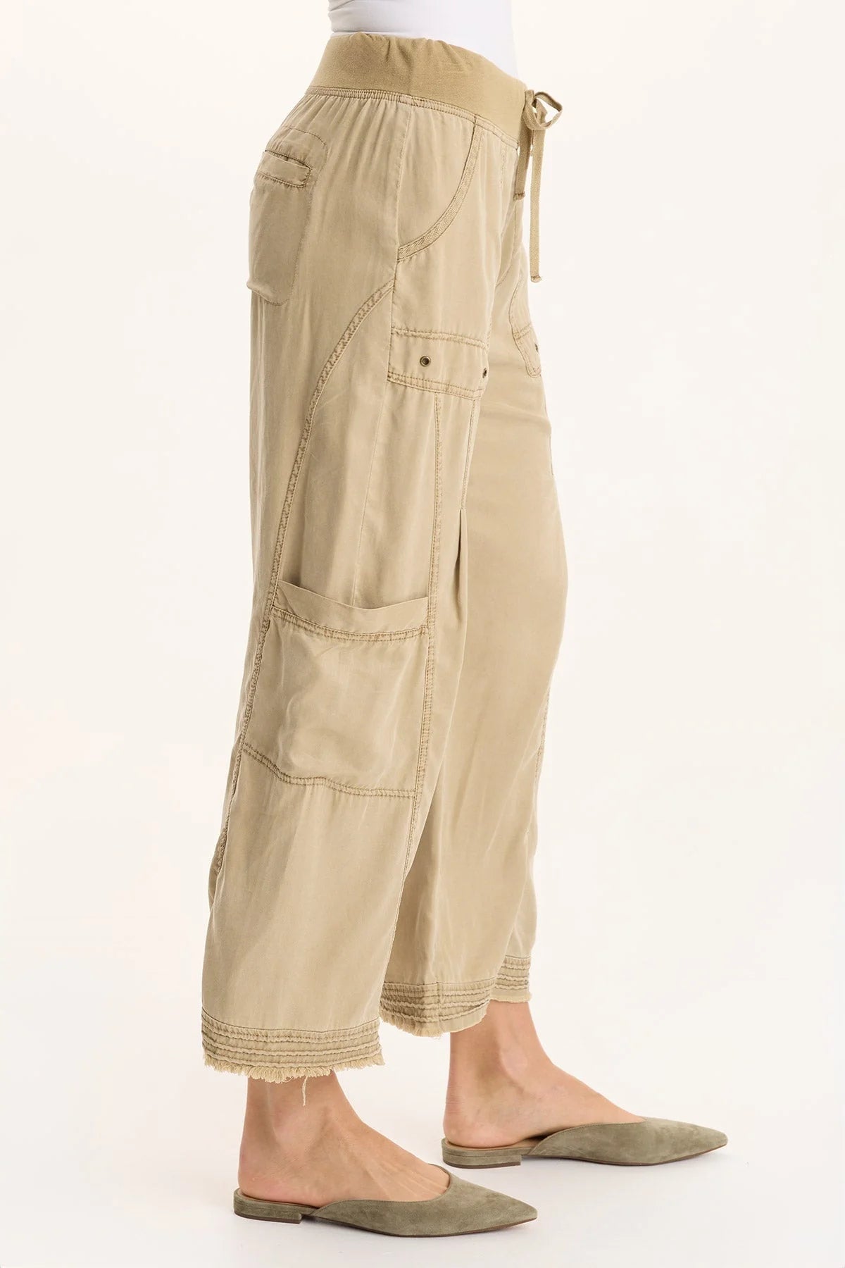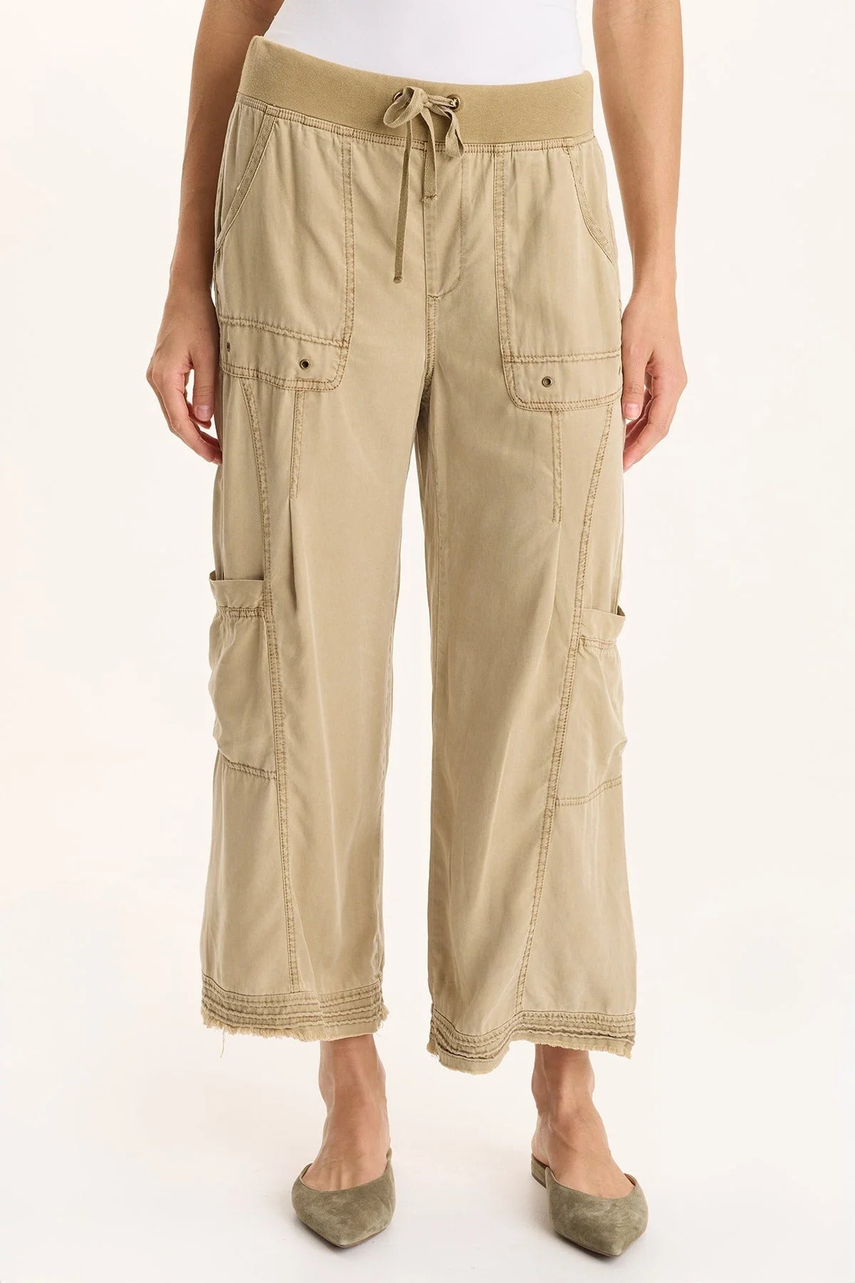 A stretchy, thick knit drawstring waistband ensures extra comfort on this wide-leg Soft Twill cargo style. Plentiful pocket, an added central pleat at the leg for added soft volume, and raw-edge hem round out the utility-inspired style.