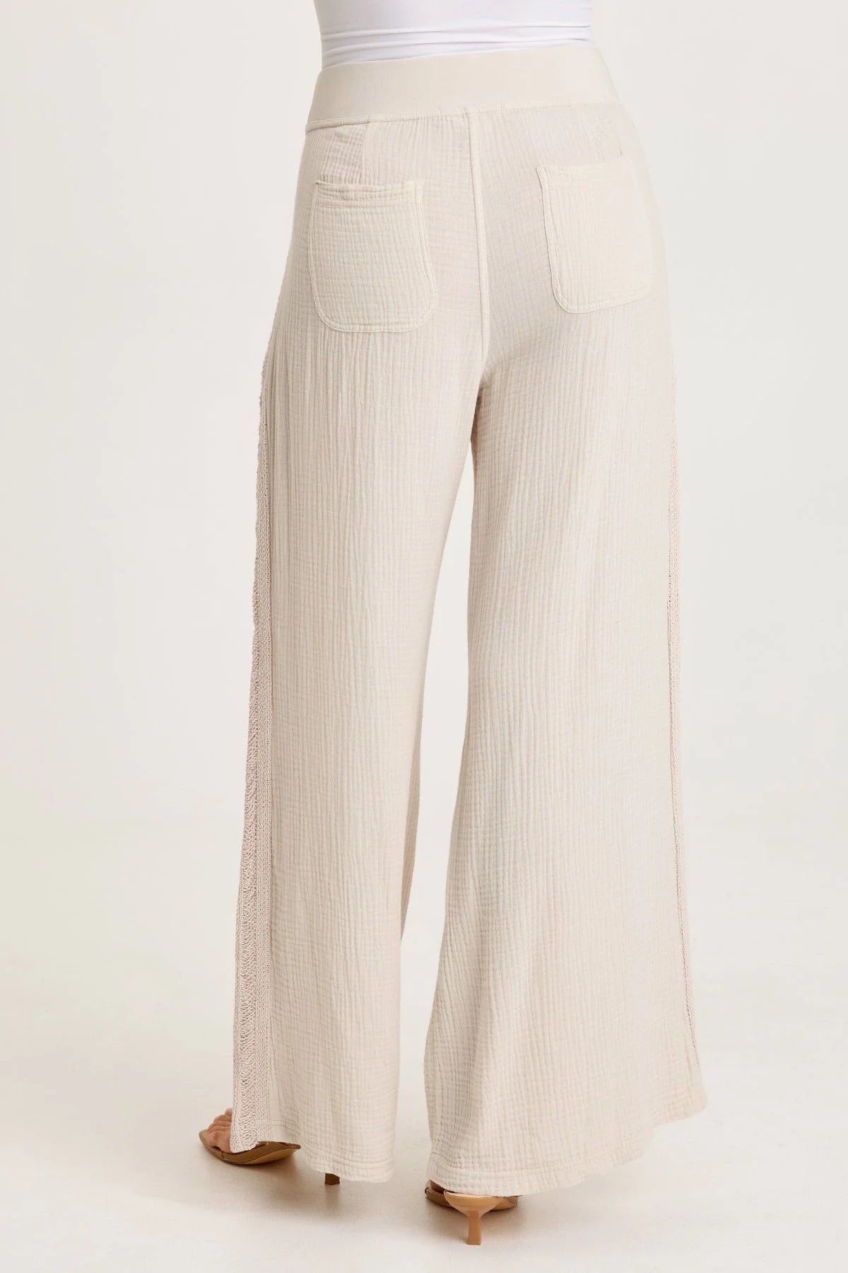 A wide leg silhouette with a ladder lace trim detail paired with front and back pockets and a pull-on waist.